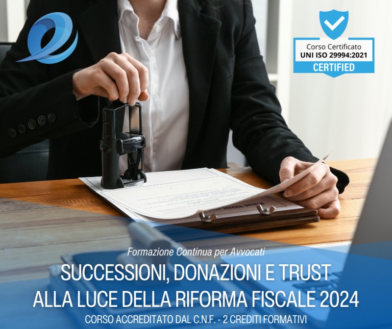 Il corso esamina le recenti novità introdotte in materia di successioni, donazioni e trust alla luce della riforma fiscale del 2024. Il corso è accreditato presso il Consiglio Nazionale Forense e rilascia n. 2 crediti formativi (Prot. n. RIC-2024-00003065).